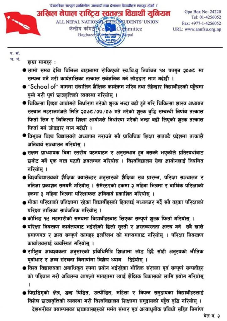 काठमाडौं । नेकपा एमालेको विद्यार्थी संगठन अनेरास्ववियुले आउँदो फागुन १४ गते स्वतन्त्र विद्यार्थी युनियनको चुनाव गर्ने गरी कार्यतालिका ल्याउन त्रिभुवन विश्वविद्यालयलाई आग्रह गरेको छ ।