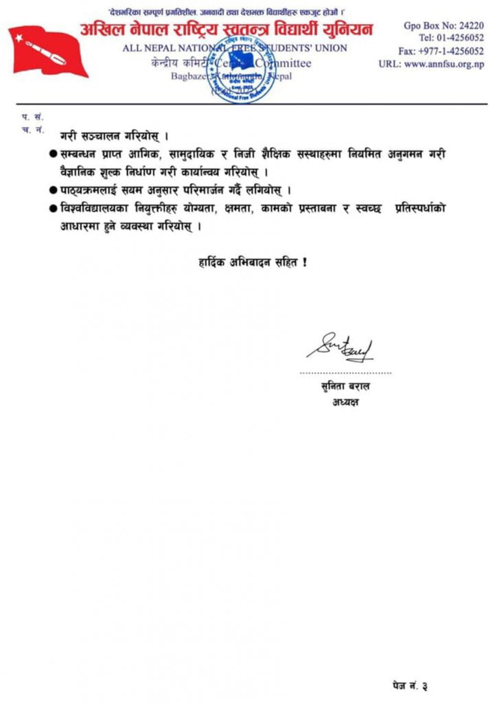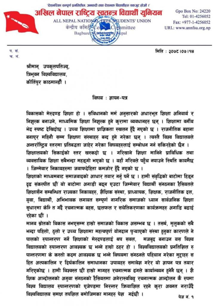 विश्वविद्यालयमा शिक्षा सुधारका विभिन्न माग राख्दै अनेरास्ववियुले चिकित्सा शिक्षा आयोगले निर्धारण गरेको शुल्क भन्दा त्रिविको चिकित्सा शास्त्र अध्ययन संस्थानले चिकित्सा शिक्षाको बढी शुल्क निर्धारण गरेको भन्दै फिर्ता लिन माग गरेको छ । त्यस्तै त्रिभुवन विश्वविद्यालयले अध्यापन गराउने सबै प्राविधिक शिक्षा सातवटै प्रदेशमा तत्कालै अनिवार्य सचलन गर्न पनि अनेरास्ववियुले माग गरेको छ ।