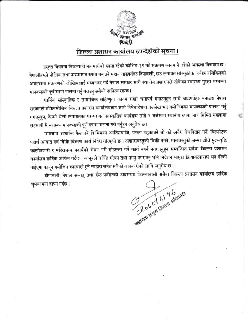 बुटवल । जिल्ला प्रशासन कार्यालय रुपन्देहीले तिहारको बेला राति ९ बजेपछि देउसीभैलो खेल्न रोक लगाएको छ । बुधबार एक सूचना जारी गर्दै प्रशासनले विश्वव्यापी महामारीको रुपमा रहेको कोभिड–१९ संक्रमणको जोखिम कायमै रहेको अवस्थामा स्वास्थ्य सुरक्षा मापदण्डको पालना गर्न पनि आग्रह गरेको छ ।