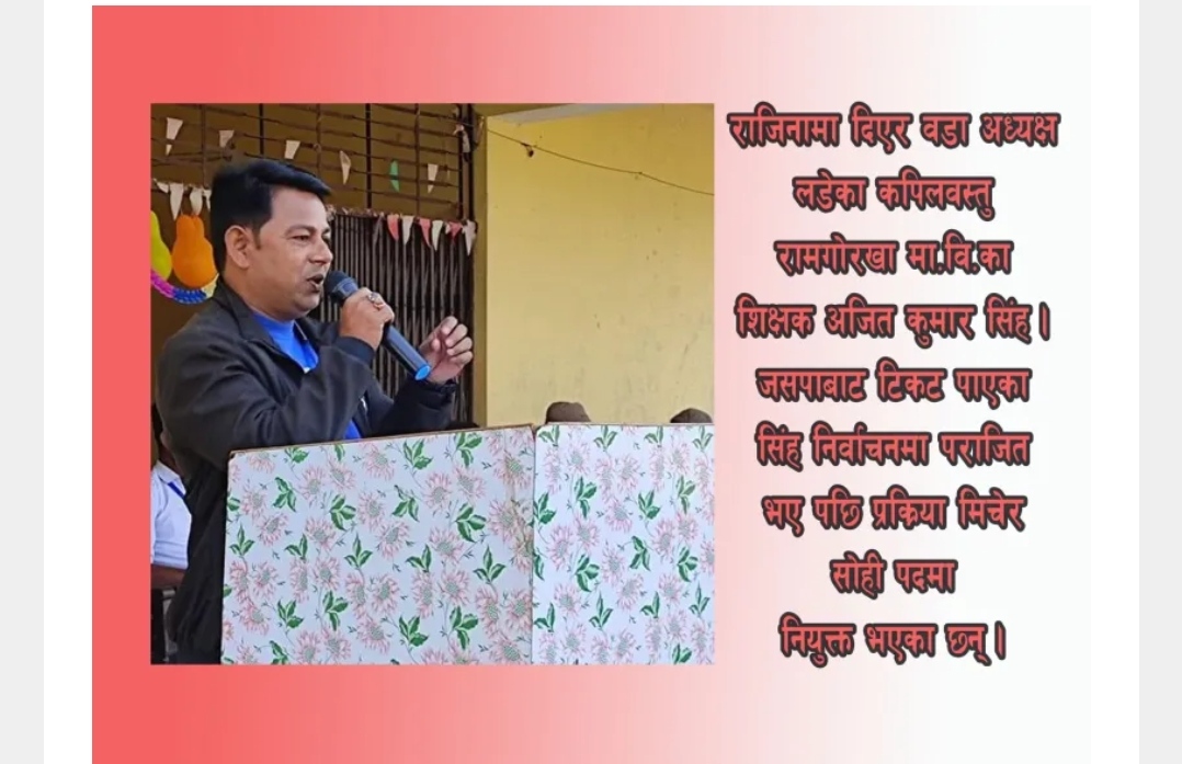 कपिलवस्तु, १८ जेठ । निर्वाचनमा पराजय भोगेका कपिलवस्तुका एक शिक्षकलाई प्रक्रिया मिचेर पुनर्नियुक्ति दिइएको छ । कपिलवस्तुको कृष्णनगर नगरपालिका ९ राम गोरखा माध्यमिक विद्यालयमा अध्यापन गराउने अजित कुमार सिंहलाई व्यवस्थापन समितिले सोझै नियुक्त गरेको छ । कृष्णनगर नगरपालिकाका नगरप्रमुख रजत प्रताप शाह अध्यक्ष रहेको व्यवस्थापन समितिले निवेदनको भरमा शिक्षक नियुक्त गरेको छ ।