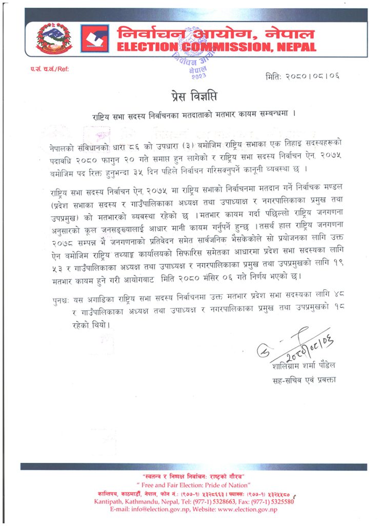 राष्ट्रियसभा निर्वाचनको मिति आगामी माघ ११ भित्र गर्ने गरी आयोगले सरकारलाई सुझाव दिएको छ ।