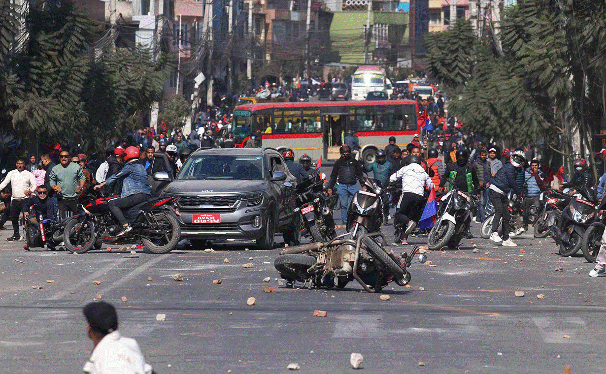 ७ मंसिर, काठमाडौं । मेडिकल व्यवसायी दुर्गा प्रसाईं समूहका व्यक्तिहरूले बल्खु चोकमा ढुंगामुढा गरेका छन् ।