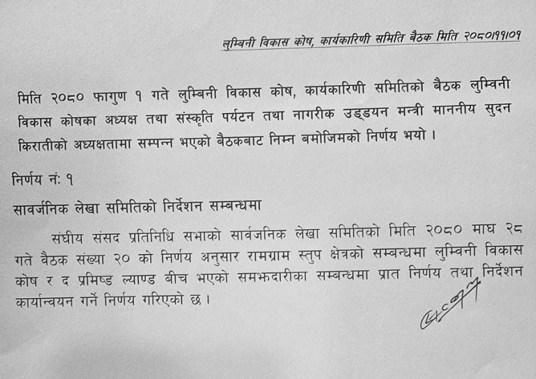 कोषका अध्यक्ष एवम् संस्कृति, पर्यटन तथा नागरिक उड्डयनमन्त्री सुदन किराँतीको अध्यक्षतामा मंगलबार बसेको कार्यकारिणी समिति बैठकले रामग्राम क्षेत्रमा प्रमिस्ड ल्यान्डसँग गरिएका सम्झौतालगायत सबै कार्य खारेज गर्ने निर्णय गरेको हो ।