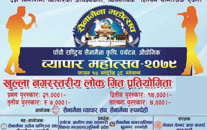 पुरा पढ्नुहोसफागुन १६, सैनामैना । पाँचौ राष्ट्रिय सैनामैना कृषि पर्यटन तथा औद्योगिक व्यापार महोत्सवमा खुल्ला नगरस्तरीय लोक गीत प्रतियोगिता हुने भएको छ । “देश निर्माणमा व्यापारको आवश्यकता, व्यवसायिक हितसँगै सामाजिक एकता” भन्ने मुलनारासहित वुधवारदेखि सुरु हुने महोत्सवमा...