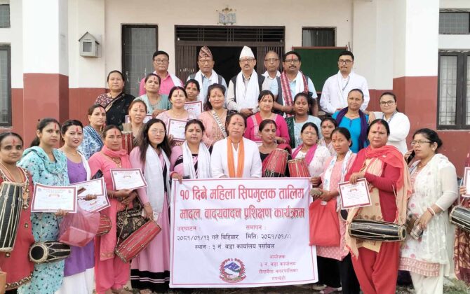 पुरा पढ्नुहोससैनामैनाकाे वार्ड नं ३ ले महिलाहरुलाई १० दिने मादल बजाउने तालिम दिएकाे छ । मादल बजाउने सिपले महिला दिदी बहिनीहरुकाे जिवनमा नया आयाम थपिने बिश्वास लिएकाे सैनामैनाका नगर प्रमुख फणेन्द्र प्रसाद शर्माले बताउनु भयाे ।...