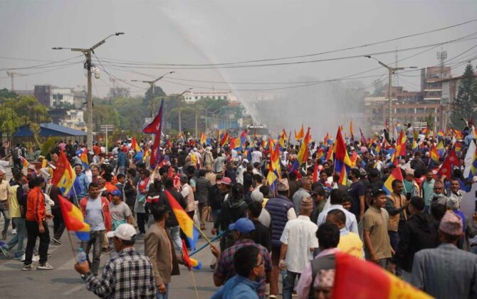 २७ चैत, काठमाडौं । राप्रपाको प्रदर्शनमा प्रहरीले पानीको फोहोरा हानेको छ । ४० बुँदे माग राखेर आन्दोलनमा उत्रिएको राप्रपाको जुलुस भृकुटीमण्डपबाट सुरु भएको थियो । सिंहदरबारतर्फ अगाडि बढ्न खोजेपछि प्रहरीले रोकेको थियो । तर जुलुस...