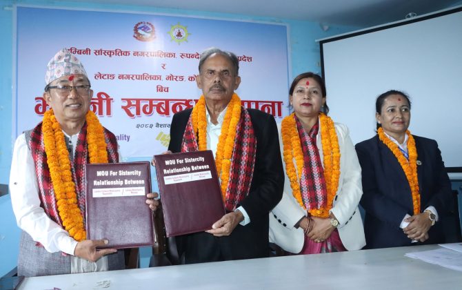 पुरा पढ्नुहोसरुपन्देहीको लुम्बिनी सांस्कृतिक नगरपालिका र मोरङको लेटाङ नगरपालिकाबीच भगिनी सम्बन्ध स्थापना भएको छ । दुई पालिकाबीच आपसी सम्वन्ध स्थापना तथा विस्तार र अनुभव आदानप्रदान गर्ने उद्देश्यसहित भगिनी सम्बन्ध स्थापना भएको हो । भगिनी सम्वन्ध स्थापना...