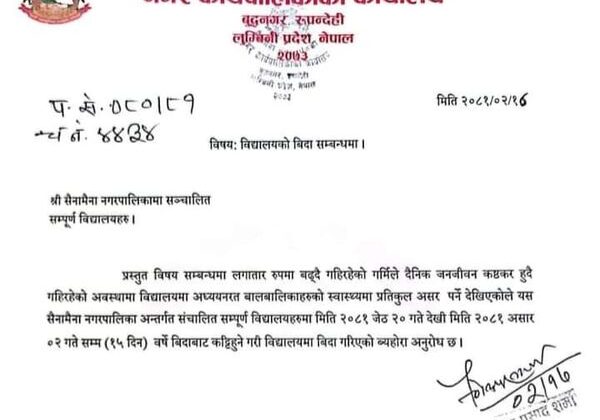 पुरा पढ्नुहोसबुटवल । रुपन्देहीको तिलोत्तमा नगरपालिकाले अत्याधिक गर्मी बढेपछि विद्यालयलाई असार १४ गतेसम्म विदा दिएको छ । नगरप्रमुख रामकृष्ण खाँणले विहीबार एक विज्ञप्ति जारी गरी अत्याधिक गर्मीका कारण पठनपाठन संचालन गर्न समस्या भएकाले शुक्रबारदेखि असार १४...