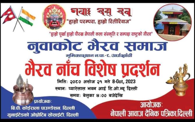 पुरा पढ्नुहोसअर्जुन थापा परम्परा हाम्रो रितिरिवाज हाम्रो पुर्खा हाम्रो पैरख नेपालि कला सांस्कृति र सम्पदा राष्ट्र को गौरब भने मुल नारा सहित महत्त्वपूर्ण नृत्यको रुपमा लिइने अर्घाखाँची नुवाकोट को भैरव नाच यहीँ आउने आइतबार अर्थात अक्टुबर...